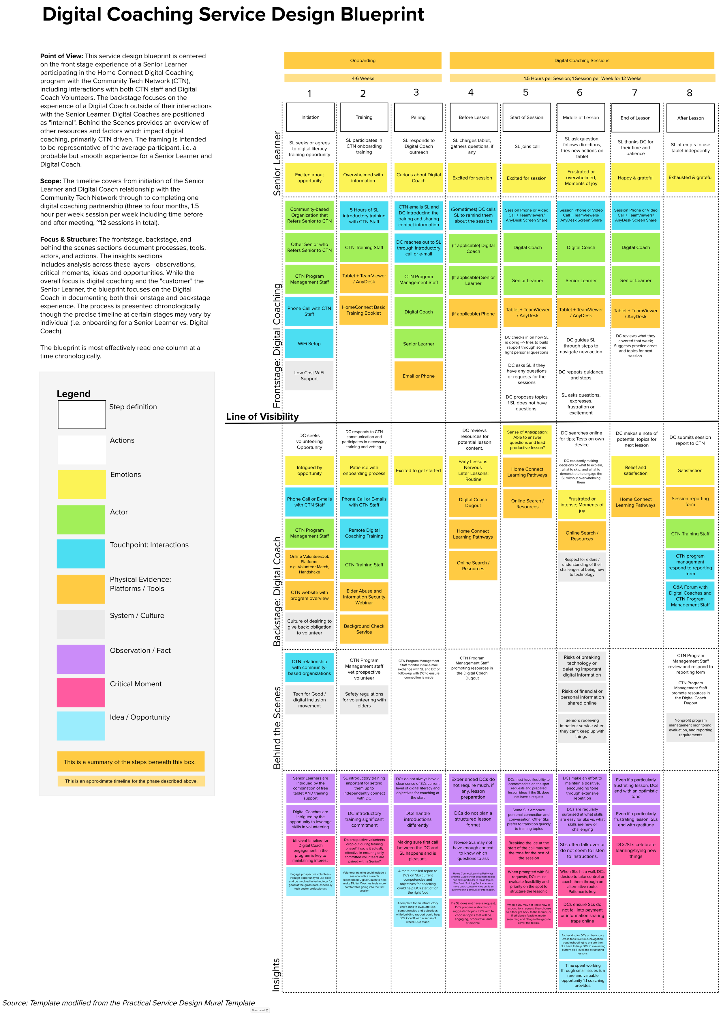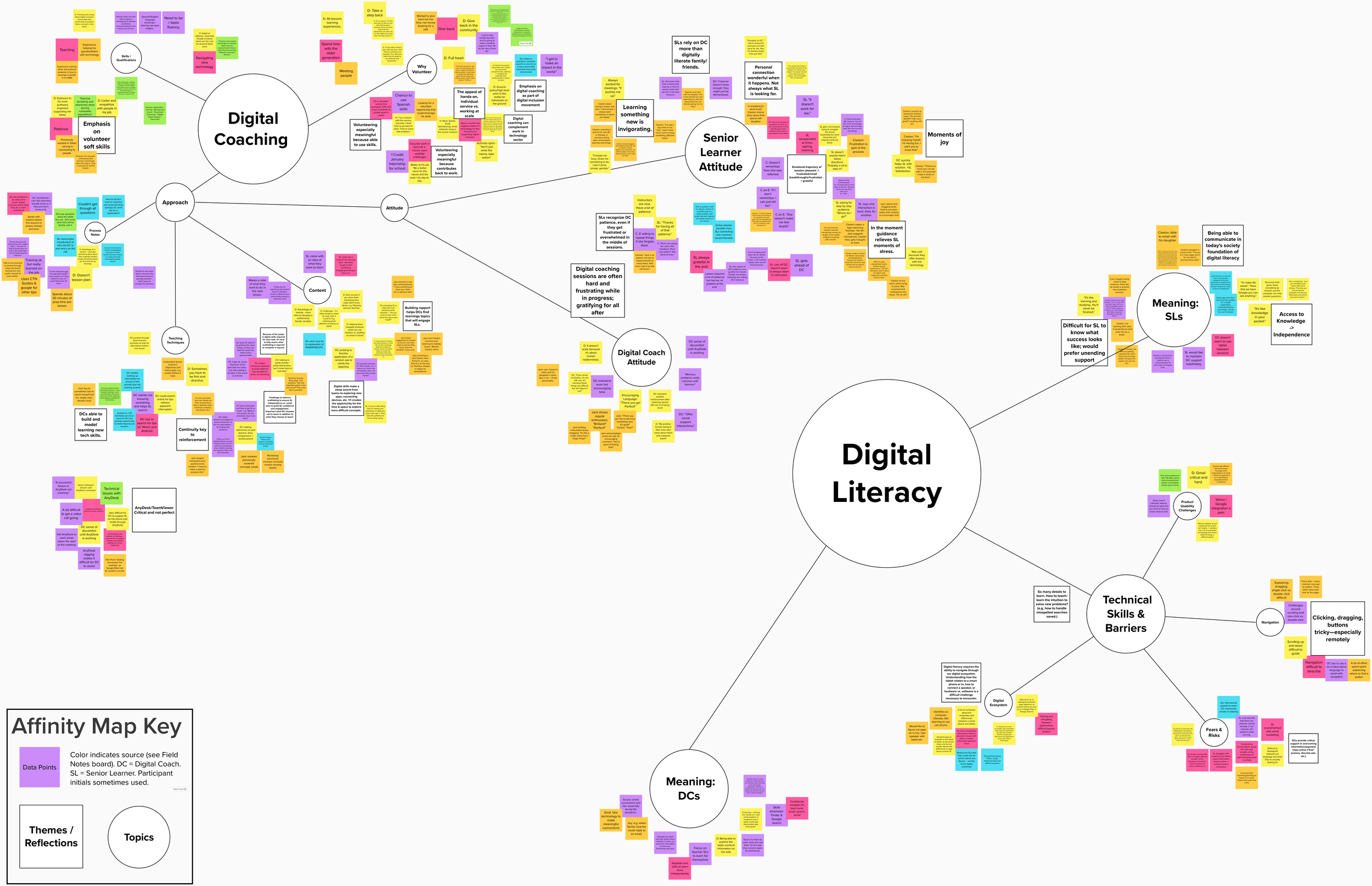 Interviews provided context on the “why” of digital coaching while observations and the artifact review provided the “how” of digital coaching and grounded the interviews. Observation of a group Q&A session complemented the digital coaching sessions in its contrasts. Especially because Digital Coaches and Senior Learners identify themselves as beneficiaries of this program, in situ observation was critical to contextualizing perspectives in reality. Affinity mapping of field and interview notes and development of a service design blueprint informed the analysis.
